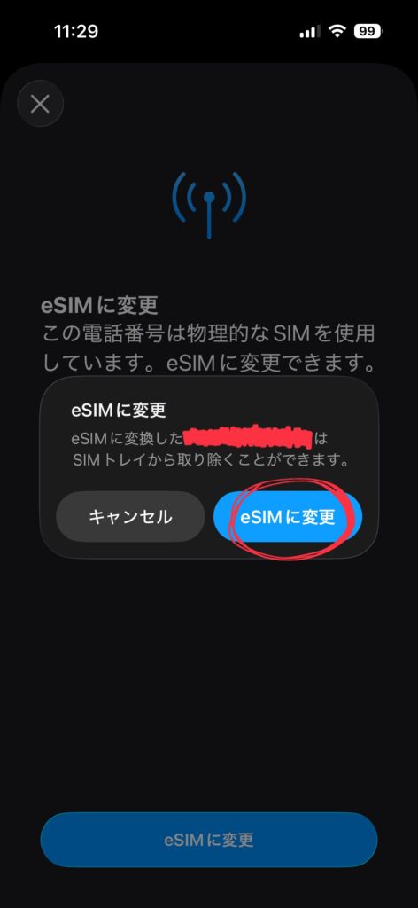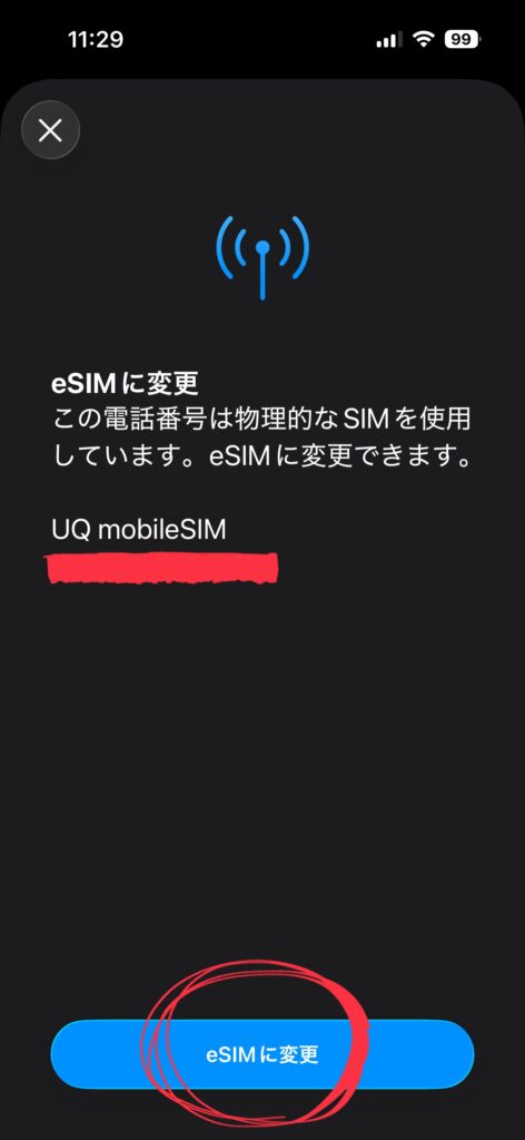 「eSIMに変更」を押下してみます。