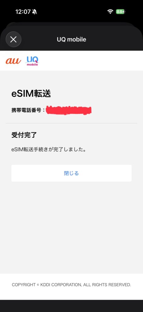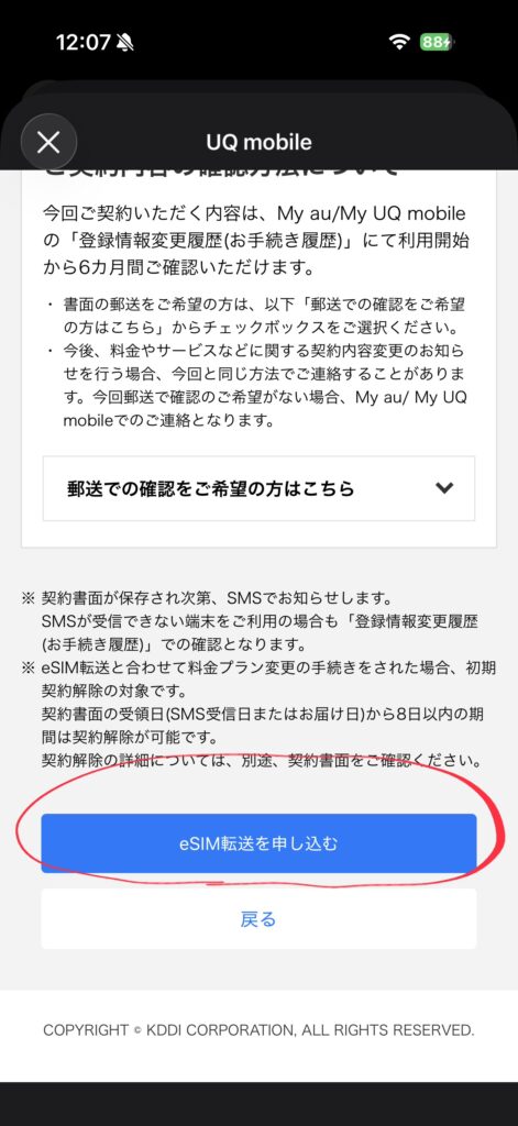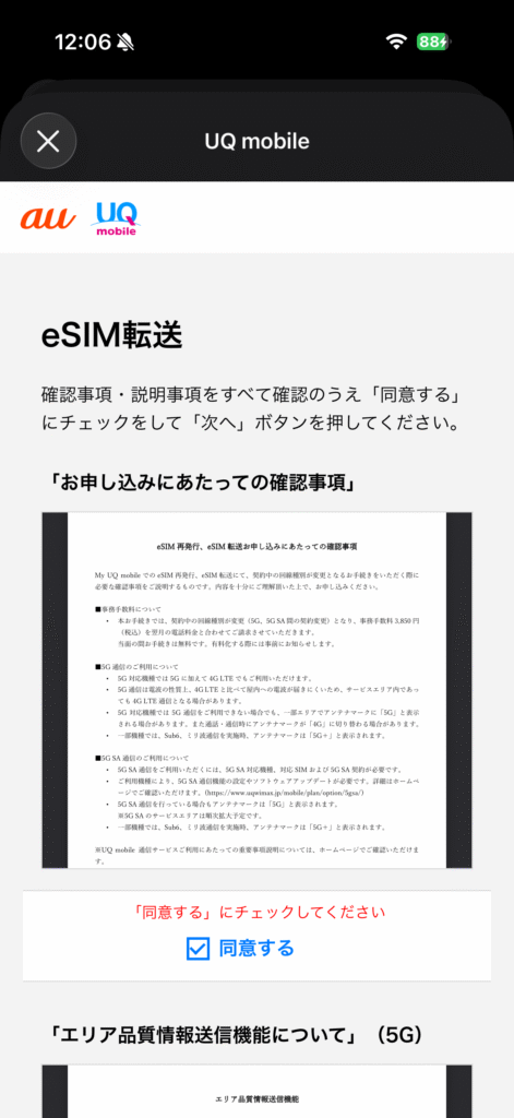 ここまで設定してようやく、eSIM転送を申し込めるらしいです。